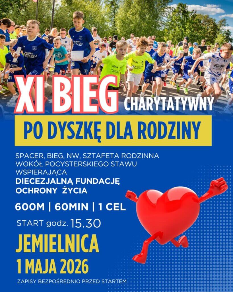 W ramach Diecezjalnego Święta Rodziny obchodzonego w Jemielnicy organizowany jest BIEG PO „DYSZKĘ” dla RODZINY, podczas którego, już po raz jedenasty, pragniemy wesprzeć Diecezjalną Fundację Ochrony Życia z siedzibą w Opolu. Akcja polega na rodzinnym lub indywidualnym bieganiu wokół stawu przy kościele parafialnym w Jemielnicy. Każdy uczestnik przez przebiegnięcie jednego okrążenia przyczynia się do przekazania z puli sponsorowanej „dyszki” (10 zł) na rzecz Fundacji. Pula sponsorowana składa się z dowolnych ofiar składanych przez osoby pragnące wspomóc to dzieło.